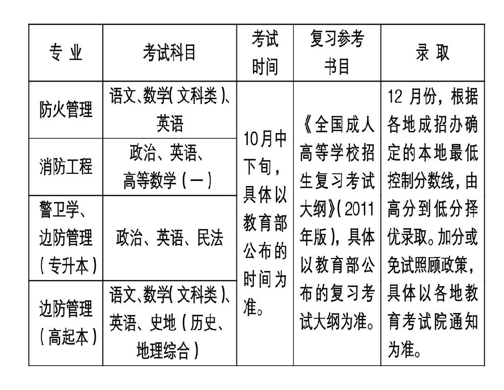 1985年,警察大学在国内率先开办消防工程、边防管理等本专科专业,1997年开办消防专业函授教育,2013年开办消防专业自学考试,是全国最早开办消防专业函授教育的学校,也是国家考委认可面向全国开考的自学考试消防专业的唯一主考学校。经过多年的办学积淀,警察大学成人高等教育逐步打造了一支结构合理、素质优良、数量稳定的专兼职结合的教师队伍,构建了一整套完善的课程和教材体系,采用“教育+网络”的方法,建立“需求牵引、资源共享、立足岗位、自主学习”的运行模式,实现多样化教育、个性化学习、智能化服务、精细化管理。