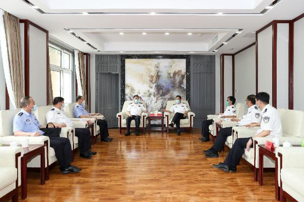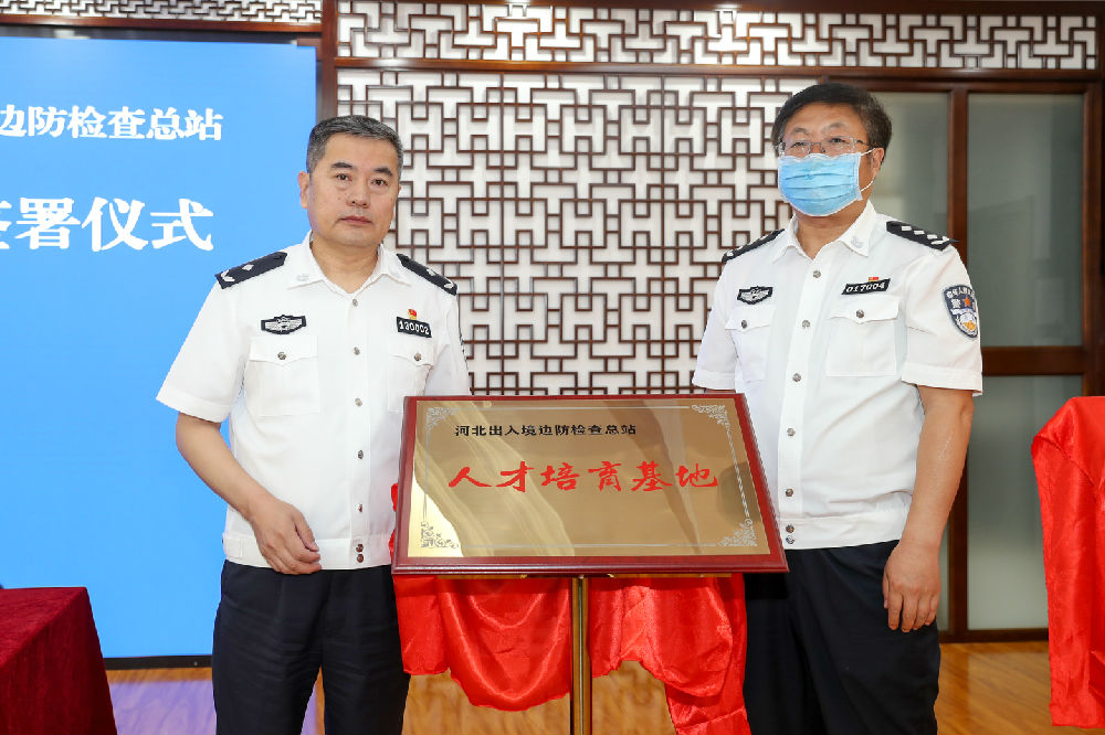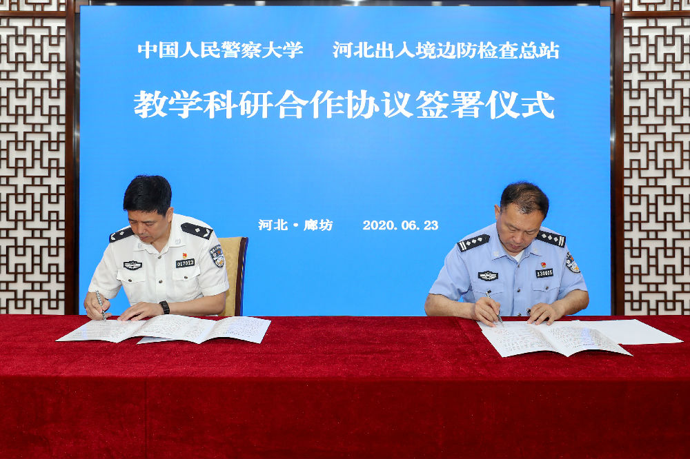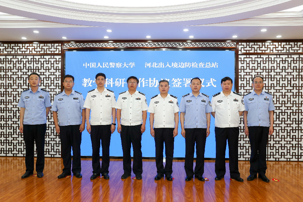 警察大学与河北出入境边防检查总站教学科研合作协议签署仪式在警察大学举办。河北出入境边防检查总站政委王昌丰、副总站长郑忠亚、办公室主任张宝善一行7人来校参加签约仪式。6月22日下午,警察大学党委书记牟玉昌、校长马金旗、副校长张平、校长助理谢朝阳会见王昌丰一行,高度评价了河北出入境边防检查总站对学校办学工作的大力支持,希望双方本着“优势互补、资源共享、互利共赢、协同发展”的原则,在人才培养、学科专业建设、理论研究、课题攻关、勤务模式改革等方面开展务实合作,产出重大成果。