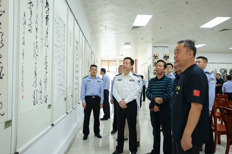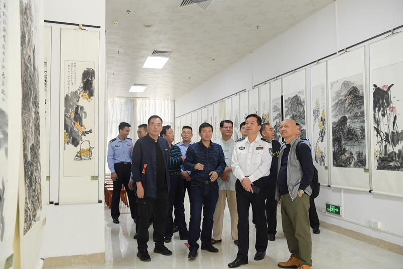 开展仪式后,校区潘慈平书记与来宾共同参观鉴赏了本次书画联谊活动展出的作品,各位艺术家现场挥毫,共同交流创作心得,研习书画技艺。本次警地书画交流活动计划为期一周,将以书法、国画为载体展览展出广东省书画艺术家及校区师生作品48副,为校区师生送来了一场书画艺术的盛宴。