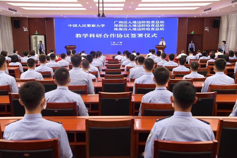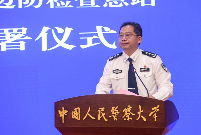 马金旗代表警察大学党委对三个总站长期以来对警察大学的大力支持,总站领导高瞻远瞩的设计和亲力亲为的推动表示衷心感谢。他指出,合作协议的签署是落实公安部党委、国家移民管理局党组关于校局合作办学战略部署的重要举措,是警察大学与三个总站携手共进、共育人才的新起点,衷心期待双方的合作结出累累硕果,在共建、共治、共享中实现高质量的发展。马金旗向参会人员介绍了学校服务面向、发展定位、专业设置和办学特色,就进一步推动未来的合作提出四点建议:一是提高站位,把服务国家总体外交和高质量改革开放作为根本目标。移民和出入境管理工作与国家总体外交、改革开放大局息息相关,双方的合作要树立国家利益的高站位,增强责任感和使命感,以新担当新作为,推动国家改革开放和增长模式的质量变革、效率变革、动力变革。二是胸怀大局,把落实国家总体安全观、维护口岸边境安全作为核心任务。要紧紧围绕核心任务开展国际移民形势研判、国家和口岸安全形势评估、移民和出入境制度政策研究、口岸管理和勤务模式改革创新等工作,通过双方的努力,使人员出入境更加便利,通关效率更加顺畅,口岸和边境地区的安全更加牢固。三是聚焦关键,把推动落实大湾区战略和警务模式创新作为重要抓手。要紧密对接粤港澳大湾区建设国家战略,紧扣警务模式创新,组织研究团队,集中开展理论与实战研究攻关,培育产出更多兼具实战指导性和工作前瞻性的科研成果,为推进“平安湾区”建设发挥重要作用,为移民和出入境警务模式改革提供借鉴示范。四是精准对标,把建设省部级示范基地作为努力方向。要围绕协议内容,精准对接教育部、公安部建设实践教学基地的规范和标准,科学谋划,深化协同,全力保障,积极开展高质量、高效率的合作,努力打造成为警察大学与移民和出入境管理机构的合作样板,打造成省部级示范基地,对公安高等教育乃至全国高等教育,起到示范引领作用。