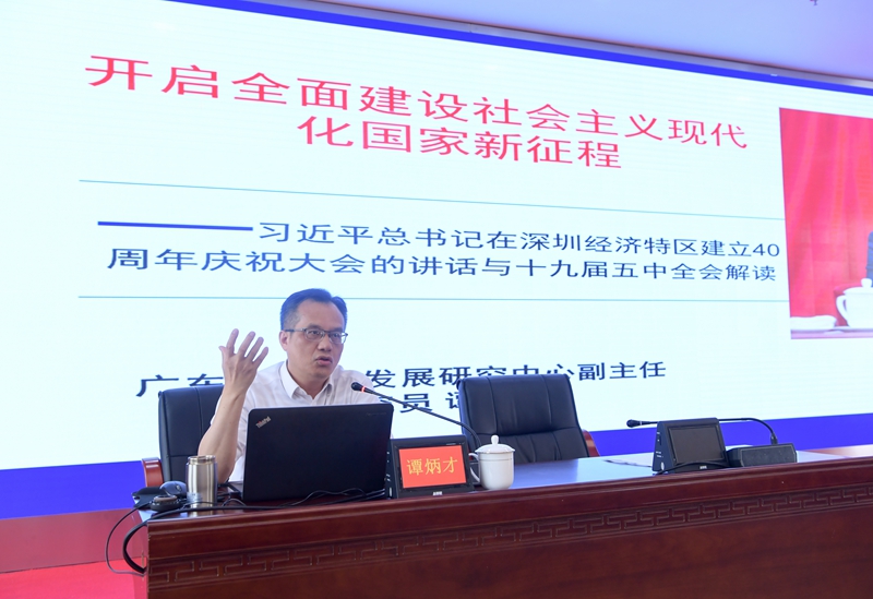 为深入学习宣传贯彻党的十九届五中全会精神和习近平总书记在深圳经济特区建立40周年庆祝大会上的讲话精神,11月23日下午,广州校区召开党委理论学习中心组学习扩大会,邀请广东省委宣讲团成员、广东省政府发展研究中心副主任谭炳才来校作专题报告。学习会由学校党委委员、校区党委书记潘慈平同志主持,全体在校教职工参加了学习。
