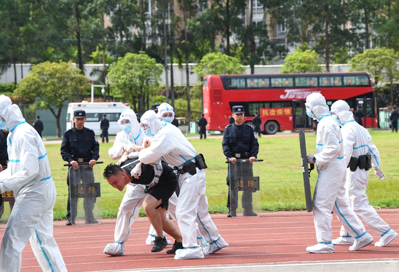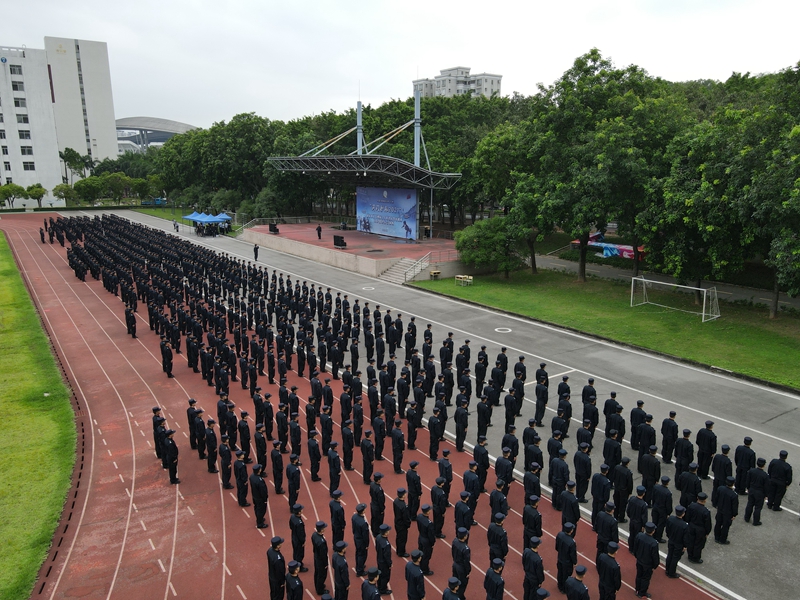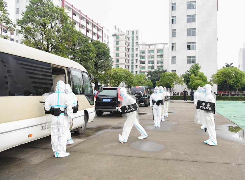 上午9时,伴随着紧急集合号,798名参训学员齐装满员仅用2分钟15秒即从宿舍到综合训练场集合完毕。刘金广主任以指挥长的身份立即宣布情况、下达开进命令和战前动员,14个学员分队闻令而动,边蹬车边穿戴防护服,边开进边补充任务。在处突阶段,演练以广东省南部地区新一轮疫情背景下,紧急拉动处置口岸突发事件为基本想定。首先在模拟边检大厅处置了扰乱秩序和“政治快闪”事件,紧接着在广州市公安局无人机中队和警犬中队配合下,各学员分队密切协同处置了口岸群体性突发事件。随后演练队伍迅速集结,刘金广主任以总导演的身份作了演练讲评,对参训学员表现出的战斗作风和学习态度给予充分肯定,同时针对演练中暴露出来的问题,要求学员进一步加快警察身份转变,不断增强法律意识,灵活运用战术战法,切实提升实战本领,并感谢局领导和机关给了校区和学员在实战训练中学习提高的机会。