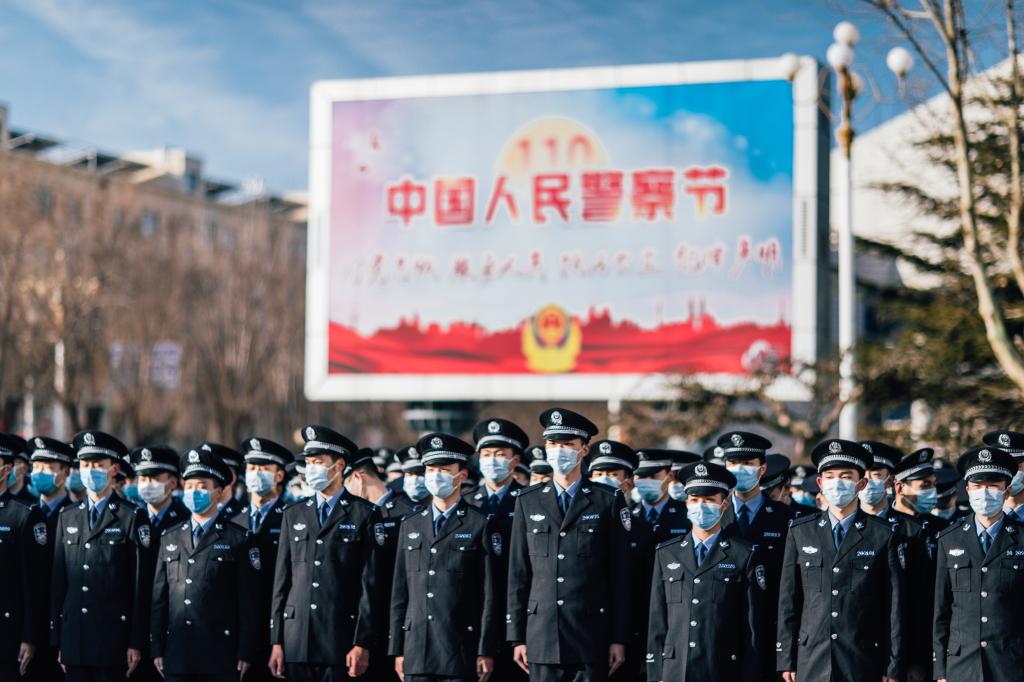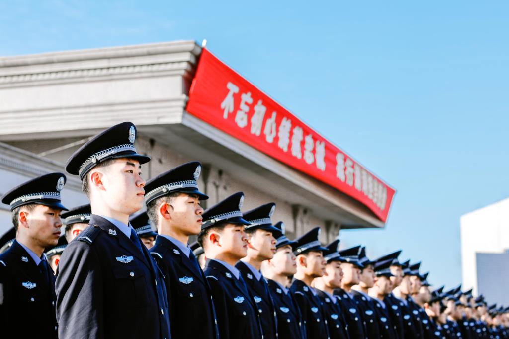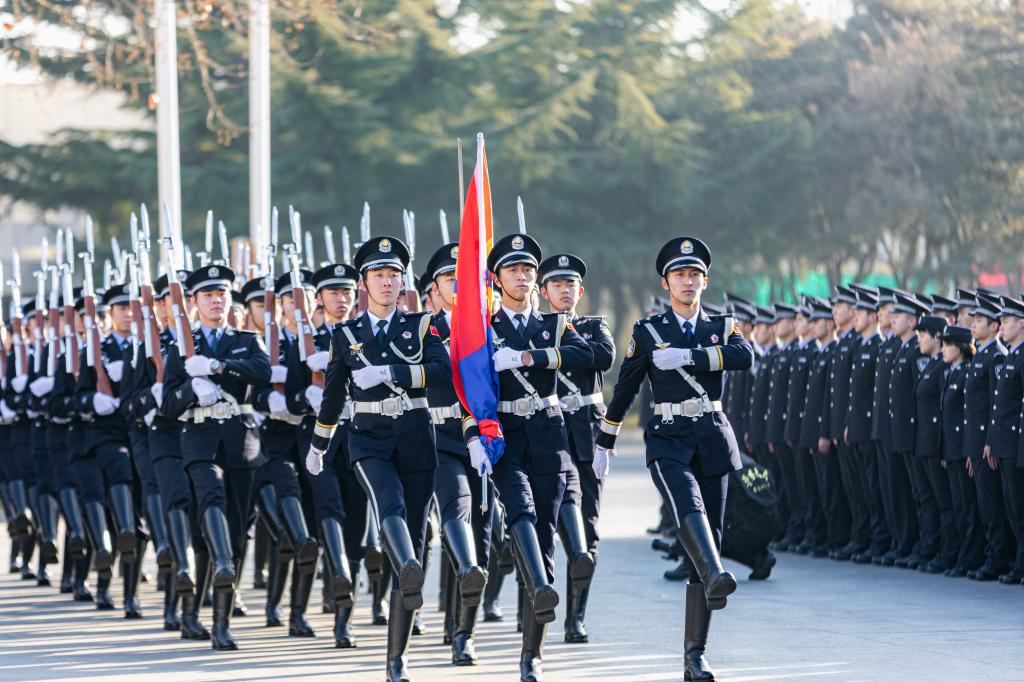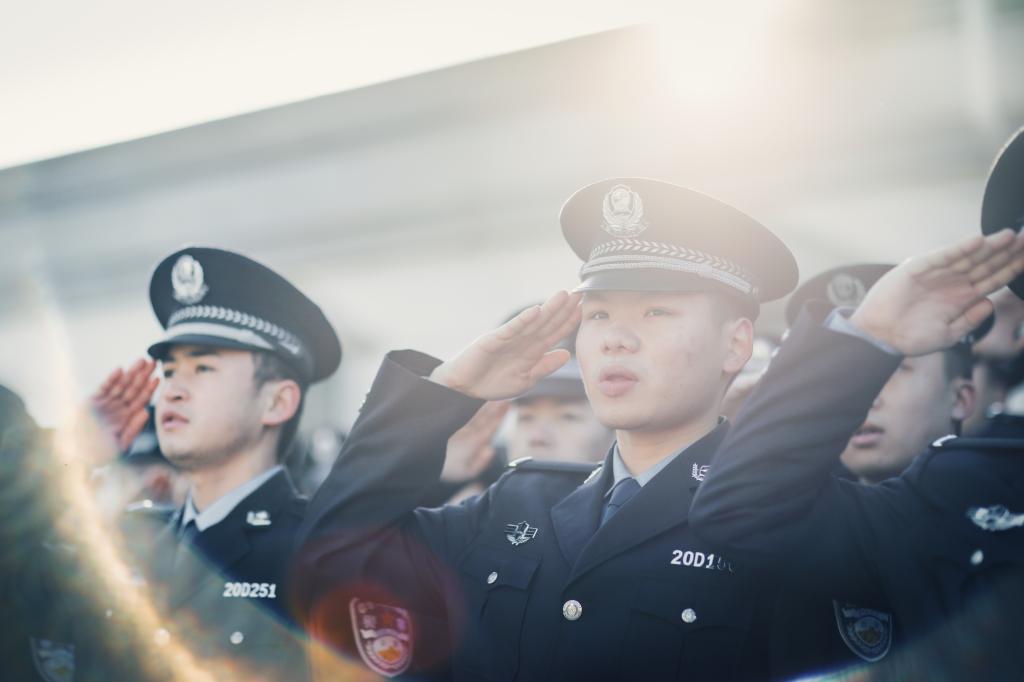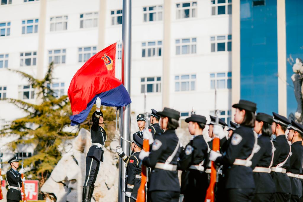 9时30分,43名仪仗队员迈着坚定的步伐,护卫着中国人民警察警旗行进到旗杆前。在雄壮的中国人民警察警歌声中,警旗冉冉升起。全体人员列队整齐、警容严整、神情坚定,面向警旗庄严敬礼。