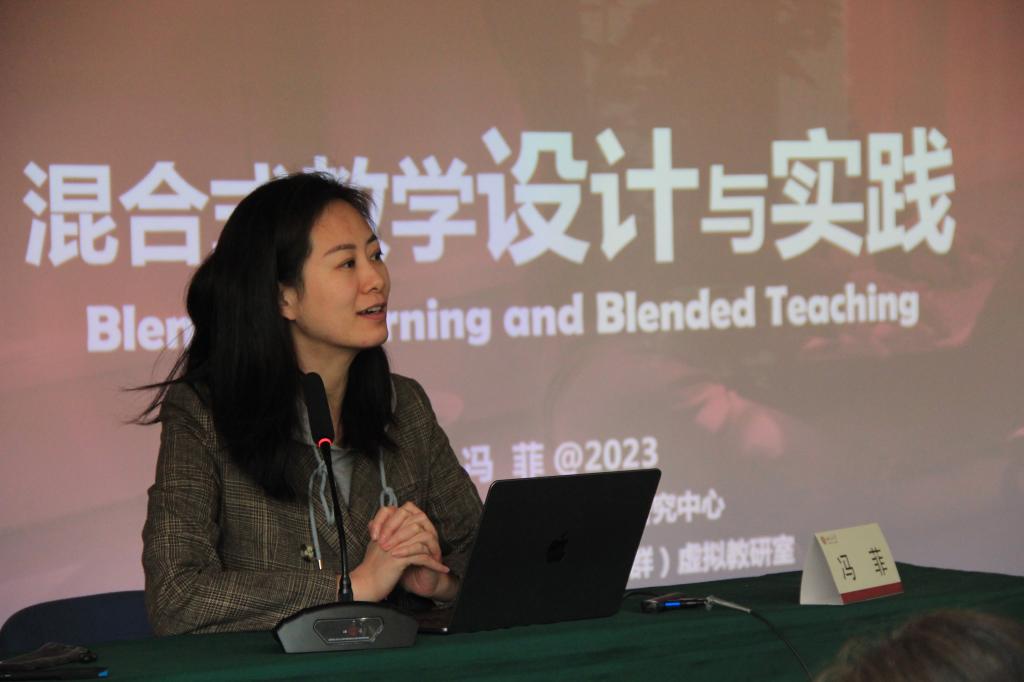 仪式结束后,北京大学教师教学发展中心综合办冯菲主任作《混合式教学设计与实践》专题报告,从怎样才算是混合式教学讲起,深入解读了混合式学习的优势,并以搭建线上学习的平台与资源、明确传统教学中的教学痛点、系统分析课程的教与学流程和理解学生学习状态及其发展等4个角度,详细分析讲授了混合式教学设计的要点。