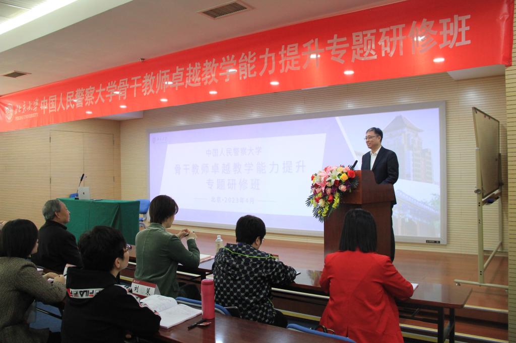 开班仪式上,吴宝科教授对警察大学参训教师表示热烈欢迎,并以丰富精彩的事例,深刻阐述了北京大学以天下为己任的担当精神和敢为天下先的创新精神,极大地激发了参训教师的学习热情。刘义祥副校长做开班动员,深情回顾了两校战略合作经历,对北京大学承办本次研修班表达了谢意。他指出,本次专题研修班是学校近年来第一次大规模组织教师到一流大学进行学习培训,这既是深入开展学习贯彻习近平新时代中国特色社会主义思想主题教育的生动表现形式,也是全面做好迎接教育部新一轮本科教育教学审核评估工作、切实提高学校教师教书育人能力的有力举措。他要求,一是要认真学习,追求卓越。要充分体悟北大优秀学风教风,积极研究学习先进教育理念和方法,丰富教学手段,提高教学水平,提升教学质量,追求卓越教学品质。二是要珍惜机会,加强交流。要珍惜宝贵机会,加强教师之间的研讨切磋,打破学院、学科、专业壁垒,加强交流学习,取长补短,共同提高。三是要学以致用、固化成果。要以本次研修为契机,及时更新教学理念,掌握先进教学方法,应用于教学实践,不断提升课程教学“两性一度”。要扎实做好课程教学团队建设,做好培训成果的分享交流,争取研修成果能够惠及全体师生。