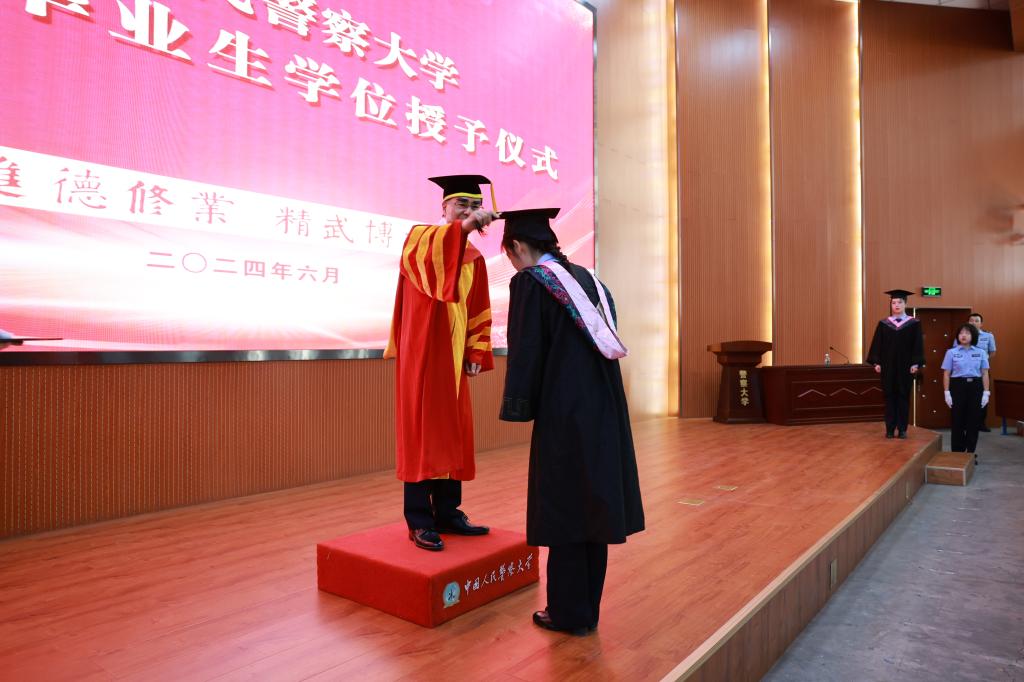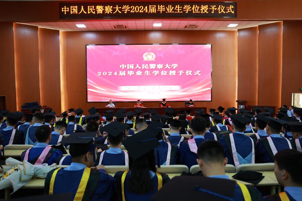 6月24日,警察大学2024届毕业生学位授予仪式在报告厅举行。243名本科毕业生代表和188名硕士毕业生身着学位服参加仪式。校长马金旗、副校长刘义祥、潘清义、杜旭宇以及各学院领导、导师、教师代表、毕业中队干部出席了仪式。仪式由潘清义副校长主持。
