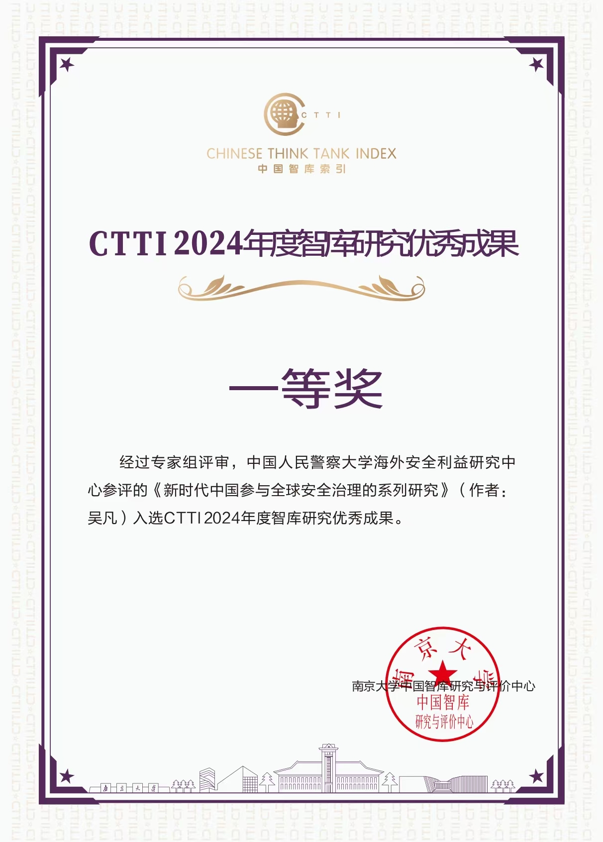 2024年11月30日,由南京大学与兰州大学共同主办的“2024新型智库治理论坛”在兰州召开,论坛公布了中国智库索引(Chinese Think Tank Index,简称CTTI)2024年度增补来源智库名单、智库建设最佳案例和智库研究优秀成果。经专家审核和筛选,警察大学海外安全利益研究中心成功入选CTTI来源智库,中心研究成果《新时代中国参与全球安全治理的系列研究》荣获CTTI2024年度智库研究优秀成果一等奖。