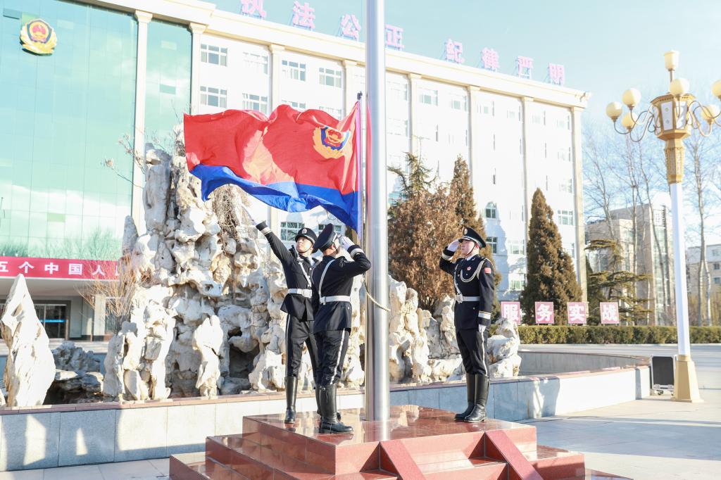 升旗手、护旗手迈着整齐有力的步伐,护送警旗走向升旗台。伴随着激昂嘹亮的《中国人民警察警歌》,升旗手迎风振臂,猎猎警旗冉冉升起。全体人员列队整齐、神情肃穆、警容严整,向警旗敬礼、向使命致敬!