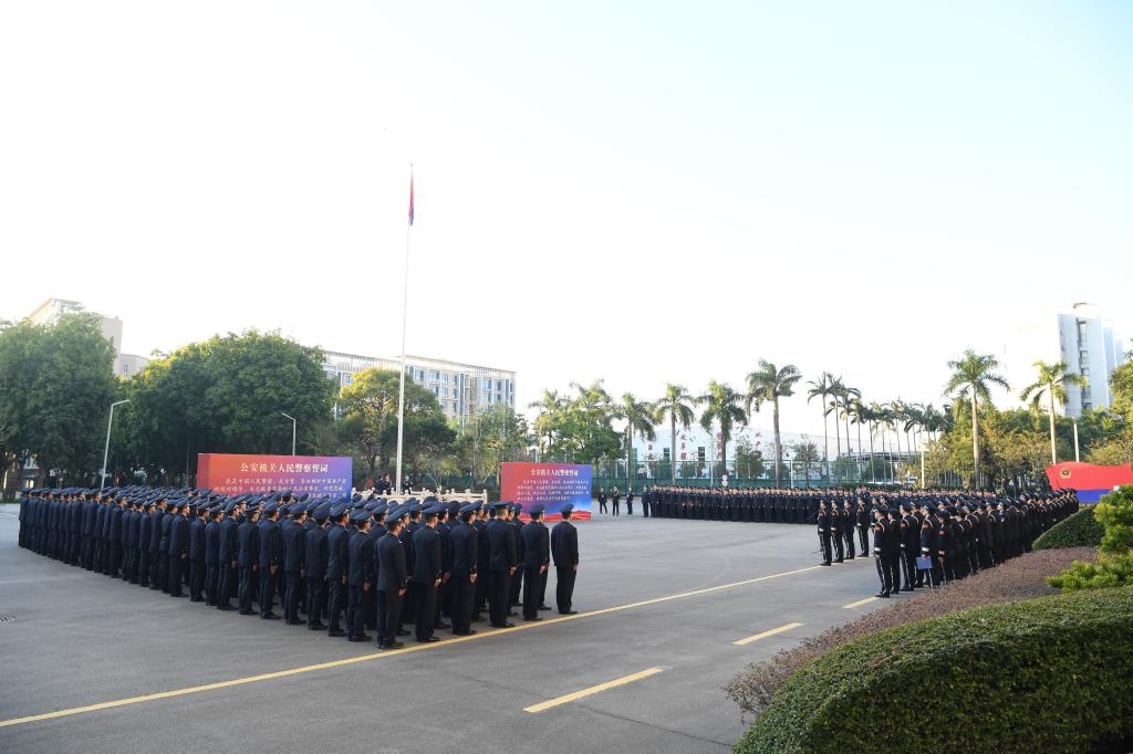张立勋带领全体人员庄严宣誓:“我是中国人民警察,我宣誓:坚决拥护中国共产党的绝对领导,矢志献身崇高的人民公安事业,对党忠诚、服务人民、执法公正、纪律严明,为捍卫政治安全、维护社会安定、保障人民安宁而英勇奋斗!”铮铮誓言回荡在升警旗仪式现场,展现了警大人忠诚履行新时代使命任务的信心和决心。