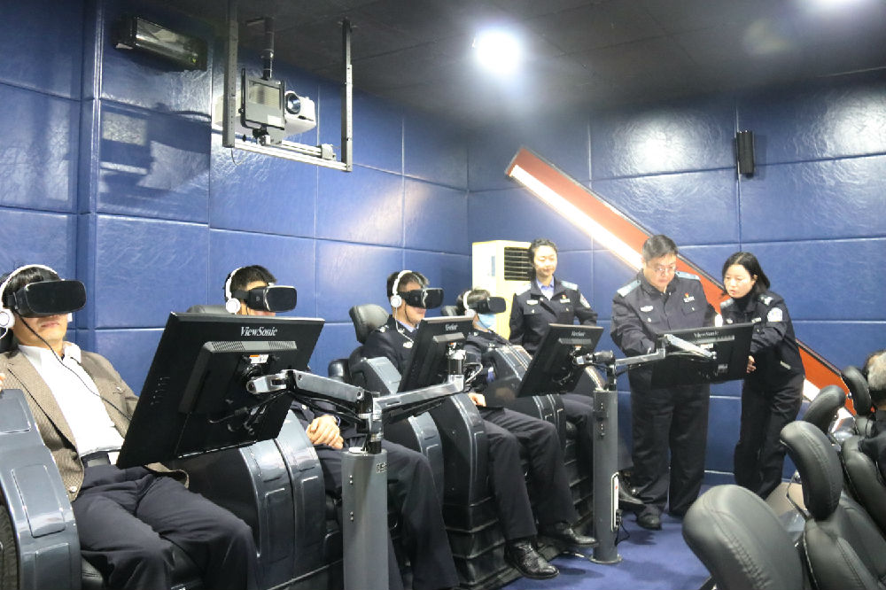 一行人在D406首先观摩了党支部党员大会、党支部委员会会议、党小组会等“三会一课”实训科目演练。各位专家领导对学生在实操实训中展示出的过硬专业素养和良好的作风给予了充分的肯定。随后,一行人在警务心理教研室专业教师的引导下参观了心理健康教育中心应急模拟训练室、心理测评训练室、心理减压调适室、沙盘心理治疗室和宣泄室等场所,并先后体验了的VR心理应激训练、个体箱庭制作和脑电生物反馈等项目内容。最后,一行人在政工实训中心观摩了“雷霆扫毒”模拟新闻发布会演练,专家对模拟新闻发布会进行点评,提出了指导意见。