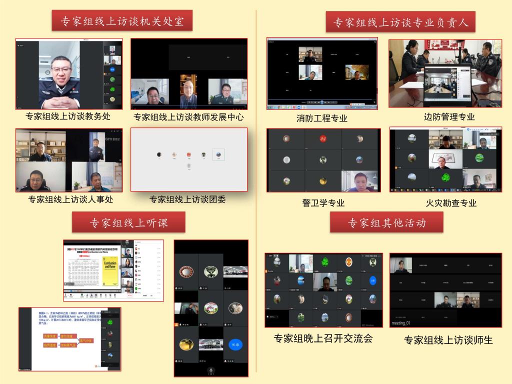 评估主要分为两个阶段,第一阶段为10月24日-11月7日,专家组通过线上审阅系统审阅自评报告等支撑材料,10月27日召开了专家组工作动员部署会;第二个阶段为11月8日-9日,专家组以线上的形式参加了学校专业建设成效汇报会,听取了教务处、发展规划与评估处及四个国家级一流专业建设点关于专业建设与管理的工作汇报;线上访谈了四个国家级一流专业建设点专业负责人、所在学院领导、师生代表,并分别与教务处、人事处、教学保障处、团委职能部门领导进行了线上交流,线上听评《消防燃烧学》《火灾调查》《边境管理学实训》等5门课程,召开专家组交流会3次,各类活动共计22场次。
