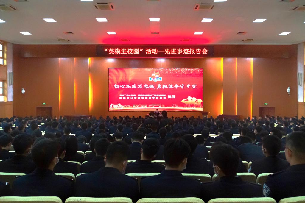 为深入学习宣传贯彻习近平总书记重要回信精神,扎实开展“缅怀英烈,争创先进”教育活动,11月2日,学校在老报告厅举办“英模进校园”活动,邀请党的二十大代表、全国公安机关二级英雄模范、威海市公安局特巡警支队政委陈强来校作专题讲座。学校师生代表600余人参加讲座。