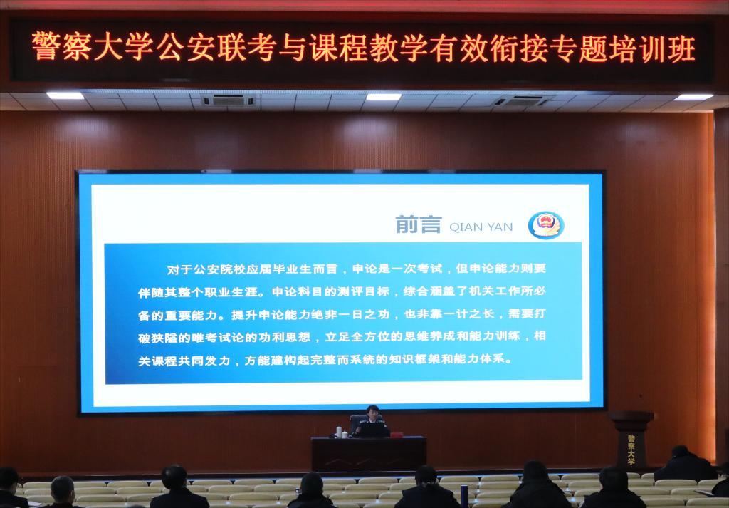 专题培训班”。本次培训班设计了申论、行测、公安专业知识等公安联考相关科目与教师日常课程教学相融合的专题培训内容。11月30日下午,本次培训班在学校报告厅顺利开班,邀请山东警察学院专业基础教研部公文写作教研室主任寇红副教授作开班第一讲。各学院领导、教研室主任、全体无课教师参加了本次培训。