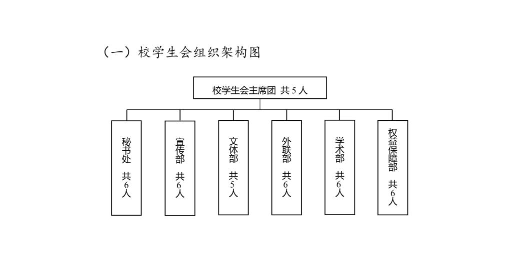 第三十二条 校学生会职能部门是校学生会的日常工作机构,在学生会主席团的领导下开展工作,工作部门设秘书处、宣传部、文体部、学术部、外联部、权益保障部等,一般不超过6个。