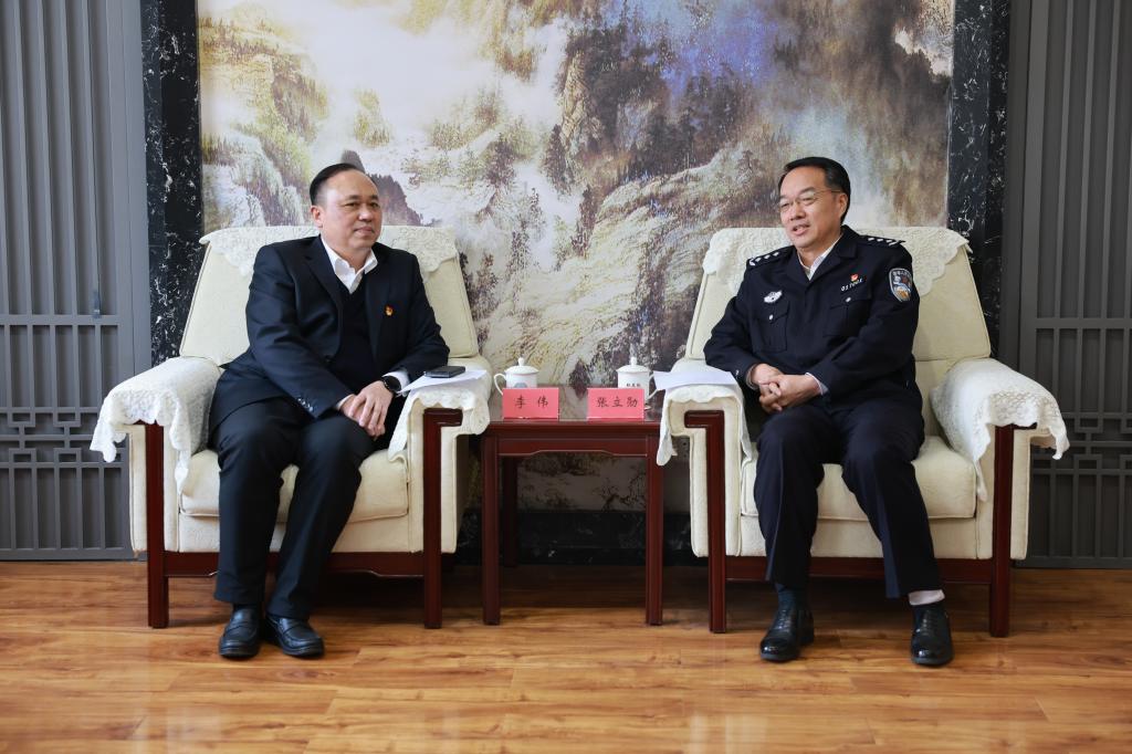2025年12月17日,天津联华集团有限公司党委书记、董事长李伟,党委副书记、总经理裴军晖率调研组一行12人来校,围绕海外安保人才培养模式、行业最新政策导向及“一带一路”沿线重点国家安保法律法规建设等核心议题,开展专题调研交流。学校党委书记张立勋会见调研组一行,纪委书记缪爱社陪同会见。