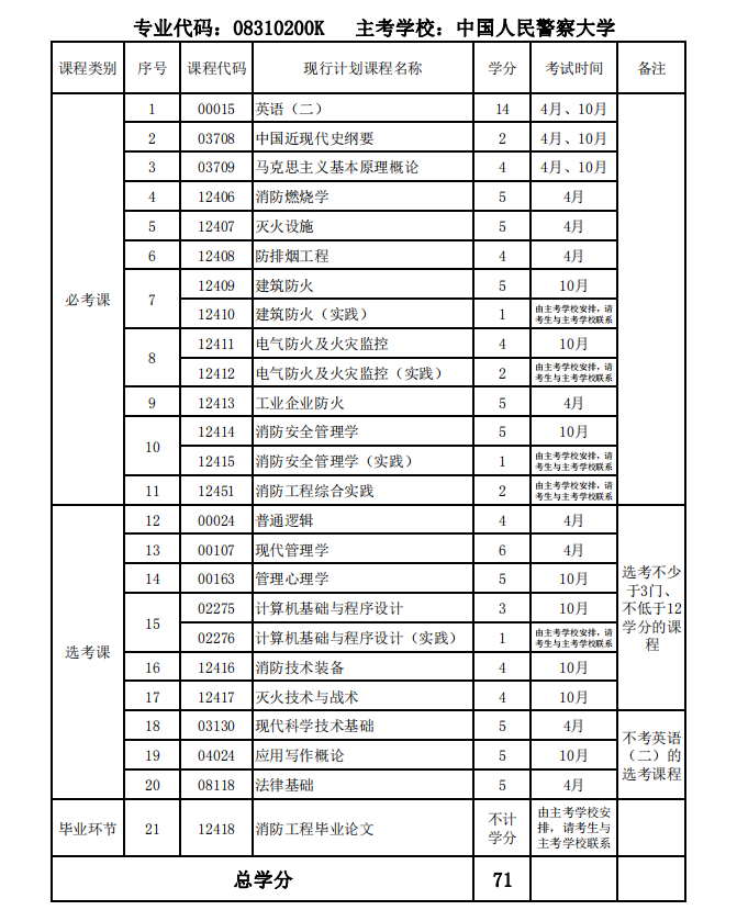广东省高等教育自学考试消防工程专业课程设置与学分