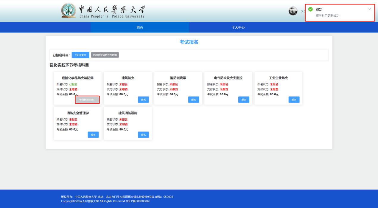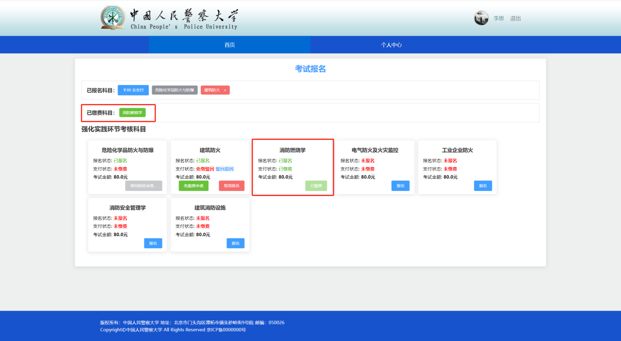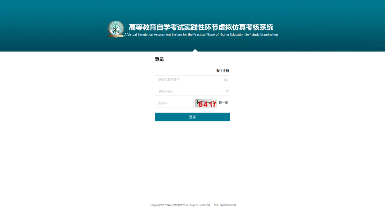 第一步、考生通过考生端(https://zkxnfzksd.cppu.edu.cn)报名考试科目。考生登录ballBET贝博BB艾弗森继续教育官网(/jxjy/);点击右侧“教学教务管理平台”栏目中的“自考报名缴费平台”后点击“2024年下半年山东省自考消防工程专业强化实践能力培养(过程性评价)考核报名缴费端口”进入高等教育自学考试实践性环节虚拟仿真考核系统页面,通过此端口报名考试科目,具体说明请看“考生操作流程“。