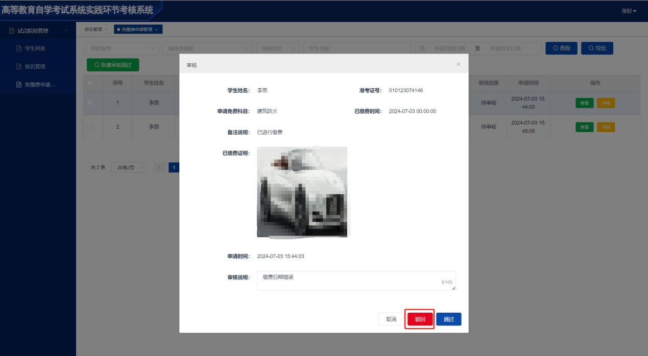 审核驳回。驳回必须填写审核说明,说明驳回的原因。驳回后,学员此项科目的免缴费申请失效。
