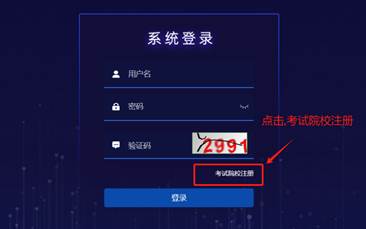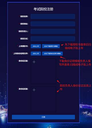 2.进入登录页面后,试点院校点击“考试院校注册”,按要求填写注册信息,下载《法定代表人身份证明书》和《授权委托书》盖章后扫描上传,等待主考学校审核。(审核通过后,主考学校通过注册时预留的联系方式发放账号和密码)