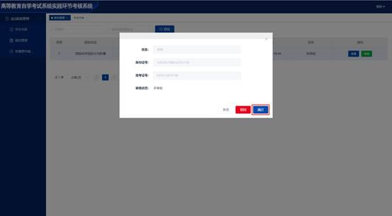点击”审核“按钮,审核考生的考试报名申请。(只有审核通过的报名,考生才能去财务软件缴费)