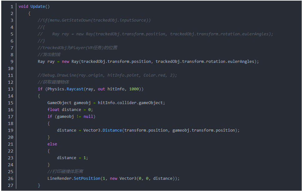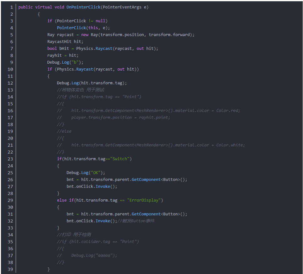 基于这个脚本,可以发出在Game面板中可见的射线,并在函数OnPointerClick()中增加碰撞逻辑,可以实现手柄与Button的交互。