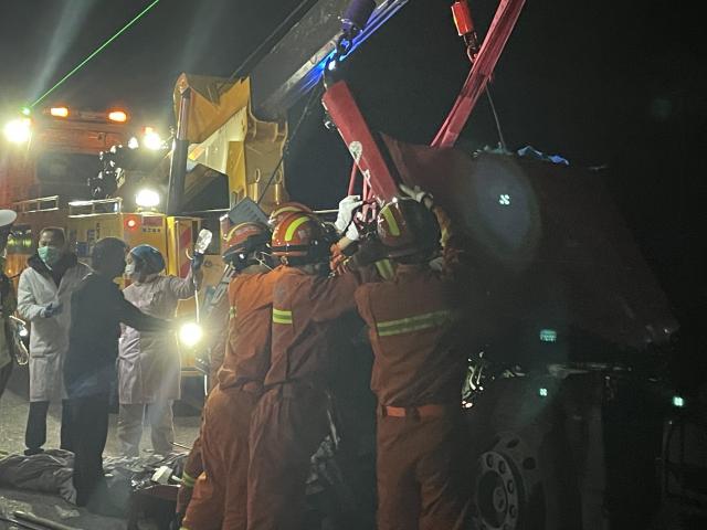 现场医护人员对其进行了初步检查,发现被困人员左腿膝盖部位被铁块砸伤,无法移动,无生命危险。了解情况后,消防队员利用液压剪扩钳及液压顶杆对驾驶室车门进行破拆,门打开后,继续对驾驶室进行扩张,增大救援空间。5时7分,高速救援工作人员利用车辆吊臂将车头吊起,创造救援空间。