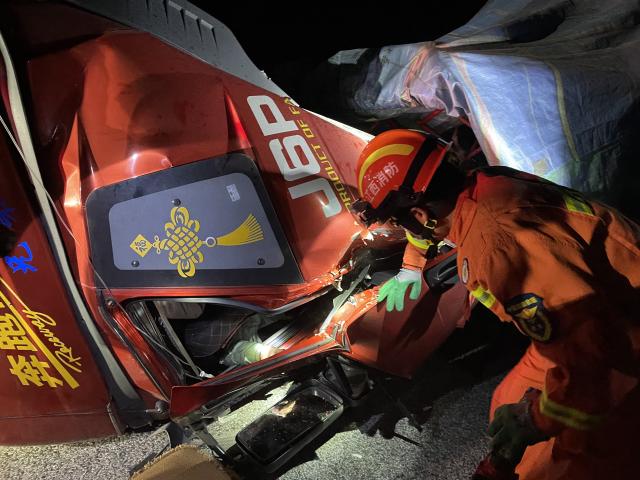 赣州:凌晨挂车追尾一人被困 消防紧急救援