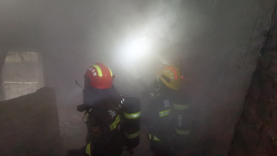 14时许,到达现场后,经侦查发现,房屋内堆有木材和各种杂物等易燃可燃物,火势正猛烈燃烧,大量浓烟冒出,房间床、柜都烧碳化,火焰并向四周蔓延,若不及时处置,恐造成更大损失。现场救援人员立即采用多功能水枪进行表面灭火,之后用直流水枪插入木材堆里面进行灌入,防止发生阴燃。同时因房子是砖木结构,经过长时间燃烧,容易发生倒塌,另一组人员对外围火势进行控制。