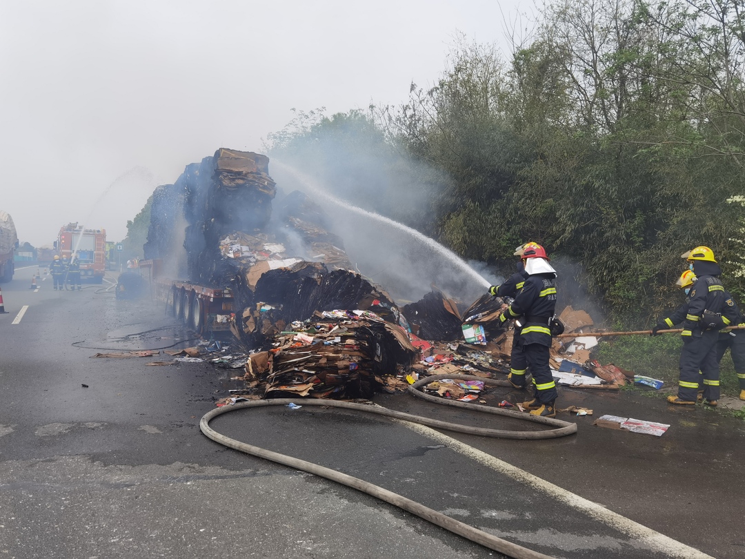 满载30多吨纸皮货车高速上起火,常德三地消防力量从不同方向赶往处置