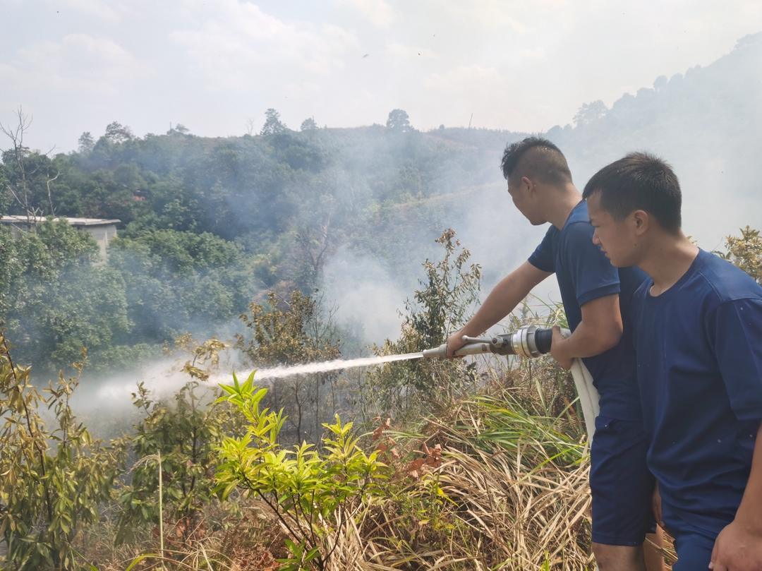 经过一个多小时的奋力扑救,明火基本被扑灭。为防止复燃,消防员继续对燃烧后杂草进行喷水,确保无复燃情况。