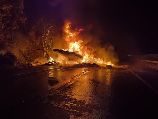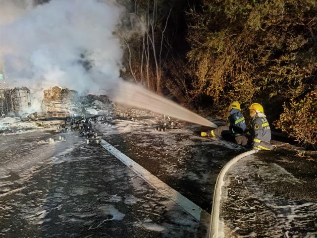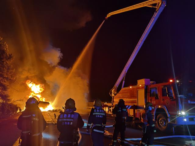 了解情况后,一组消防救援人员架设水枪远程对车身进行前期处置,同时联系高速交警协助道路车辆管控。另一组消防救援人员使用高喷车架起水枪展开扑救。1小时后,火势得到控制。因半挂车中装载的货物堆垛较多,消防救援人员持续对着火物进行冷却降温,确保不发生复燃。