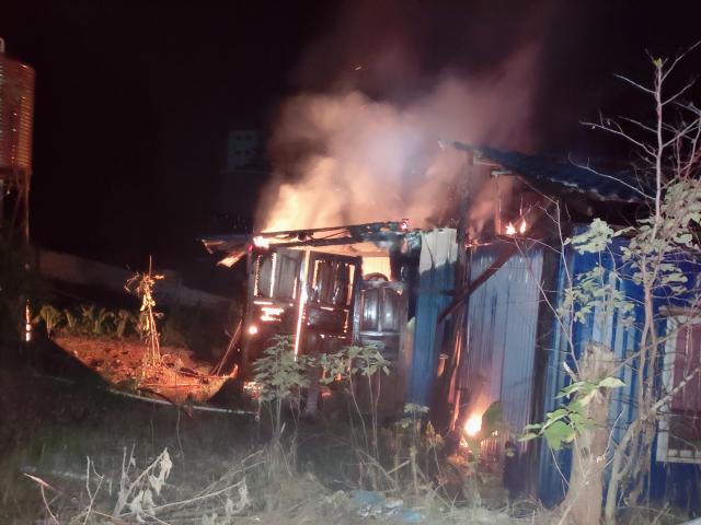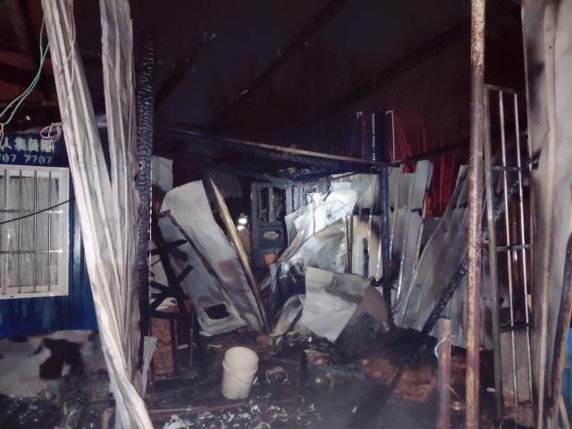 消防救援人员到达现场后,经侦查发现,着火建筑为居民自建的一个小木屋,燃烧物质为木头和屋内的一个液化气罐,屋内无人员被困,木屋内火焰熊熊燃烧,明火直窜屋顶,弥漫着浓烟,散发着浓浓的焦煳味。