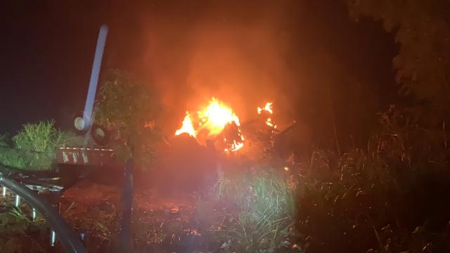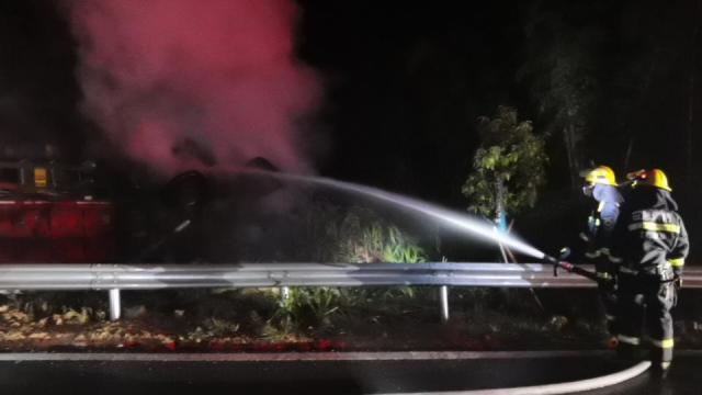 消防救援人员到达后发现,现场一辆装有砂石的货车越过公路护栏,仰翻在护栏外,砂石散落一地,货车的前半部分已经被烈火包围,火势处于发展阶段,无人员被困。