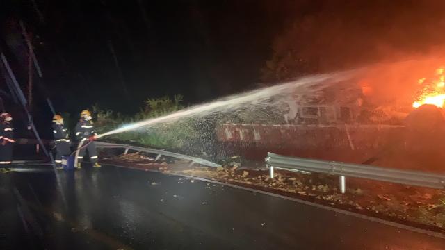 鹰潭:货车爆胎冲出防护栏引起火灾 消防紧急救援