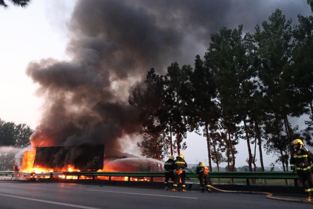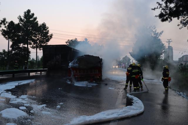 8月2日5时7分,宜春高安市祥符镇红绿灯处发生两货车碰撞起火燃烧。接到报警后,高安市消防救援大队立即调派瑞阳大道消防救援站出动2辆水罐消防车和1辆抢险救援车,21名消防指战员紧急赶赴现场处置。同时调派就近的专职消防救援队前往处置。
