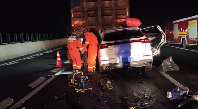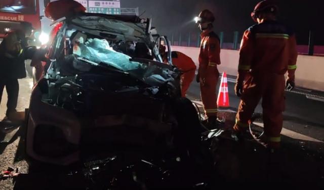 1月1日4时,南龙高速赣州市南康段往十八塘方向一辆小车追尾货车,2人被困。当地消防部门接到报警后,立即赶赴现场处置。