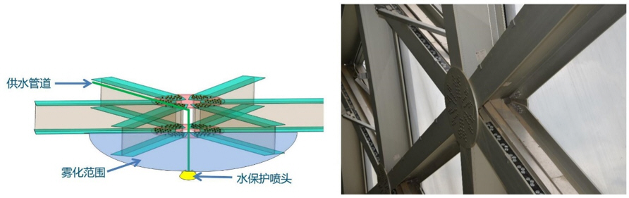保护构件的水雾喷头可从内节点盘伸出,伸出长度依据节点高度,减少对净高及美观的影响