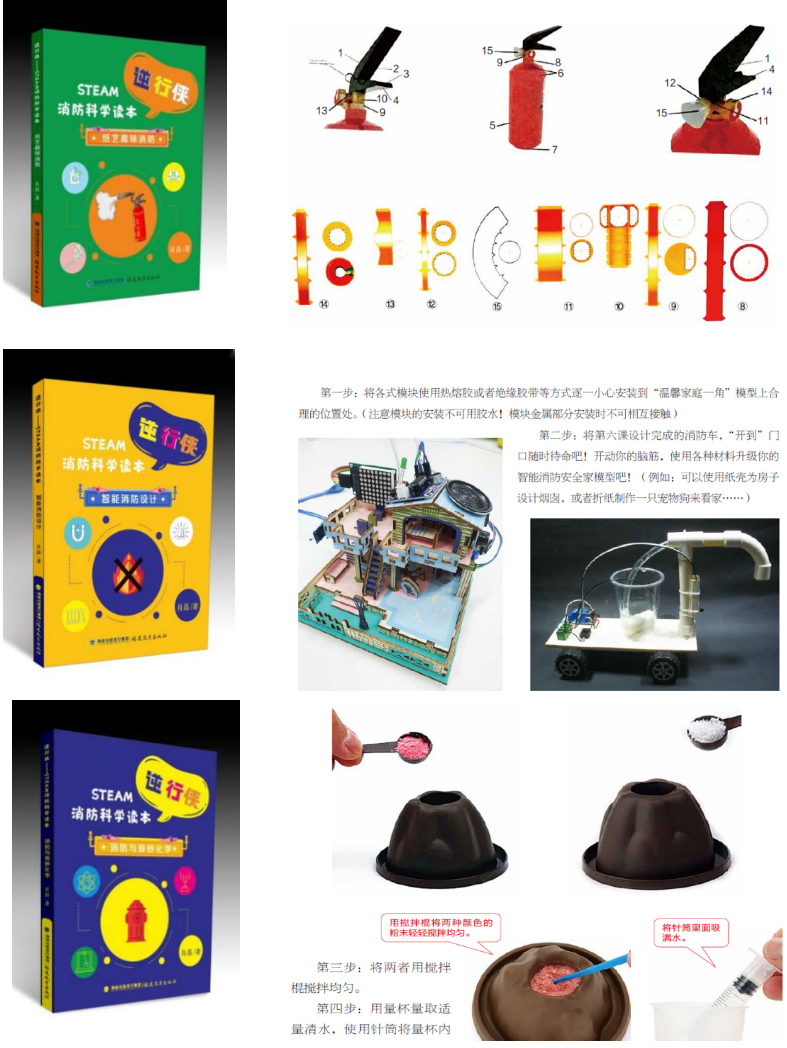 该成果为一套适合学龄儿童的具有STEAM特点的应急消防科普教育资源包。资源包内配有一套消防科学读本,分别为:《纸艺趣味消防》、《消防与奇妙化学》、《智能消防设计》。