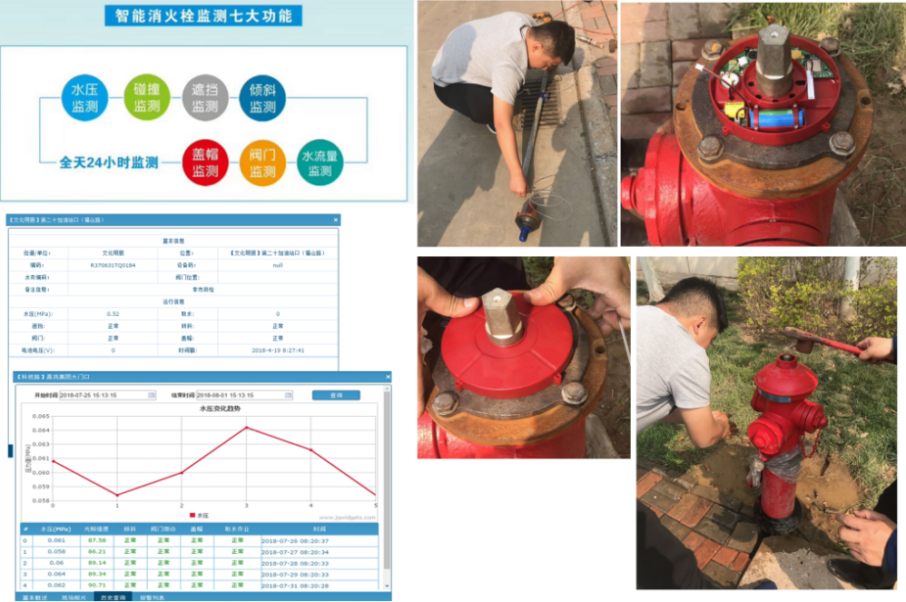智慧消火栓系统包含消火栓终端和完整的系统平台。消火栓终端能够感知消火栓的水压、流量、撞击、倾斜、埋压、阀门开闭等状态,施工时不挖土方、不打孔、不需要连接线缆,一次充电可持续工作2年,具有高可靠、低功耗、管理便捷等优势,采用综合成本低于一般市场价格,适合于已有消火栓的智能化升级。