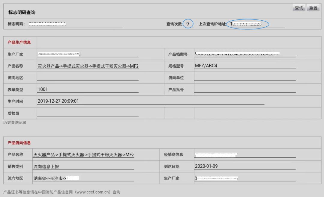 消防产品身份信息标志包括本体标志(红色,俗称A签)和验证体标志(黄色,俗称B签),每组标志均具有明码和二维码。现场检查时,可通过手机扫描二维码查询产品信息,也可以将明码输入发证机构的“消防产品流向信息查询系统”查询。 在查询消防产品身份信息标志时,需校验以下信息:①身份信息标志的查询结果应与产品铭牌标签、产品检验报告(型式试验)一致;②流向单位和经销商信息与实际情况一致;③从第2次查询开始,会显示查询次数和上次查询的IP地址。
