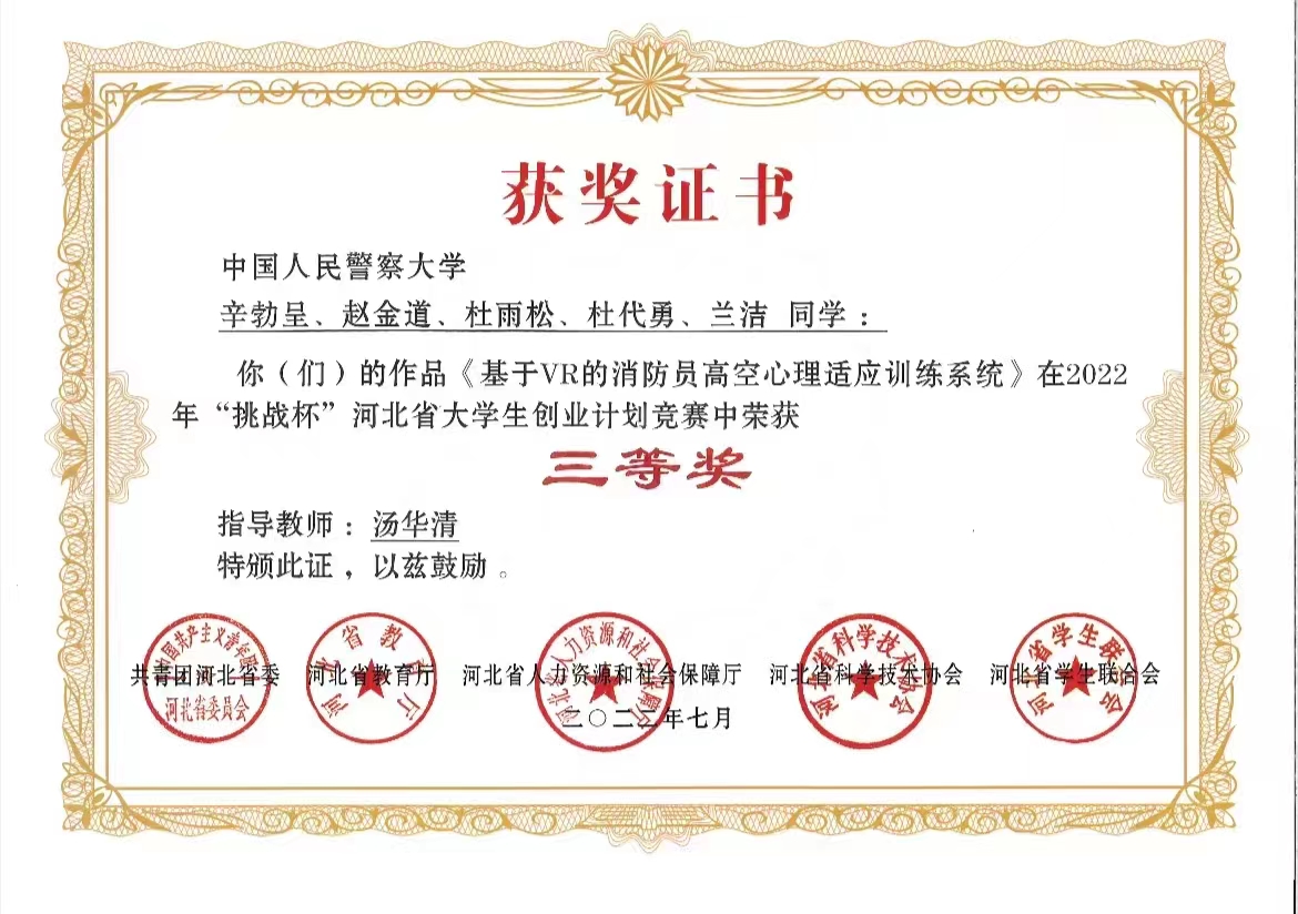 为培养学生科技创新能力,培训学生兴趣爱好,2022年4月救援指挥学院虚拟仿真实验教学中心兴趣小组,在科研处的精心组织与带领下,指导老师汤华清精心挑选研究(本科)生辛勃呈、赵金道、杜雨松、杜代勇、兰洁等同学组成参赛队伍,参加由共青团中央、教育部、中国科协、全国学联和省级人民政府主办的中国大学生创业计划竞赛并提交作品《基于VR的消防员高空心理适应训练系统》荣获2022“挑战杯”河北省大学生创业计划竞赛三等奖。