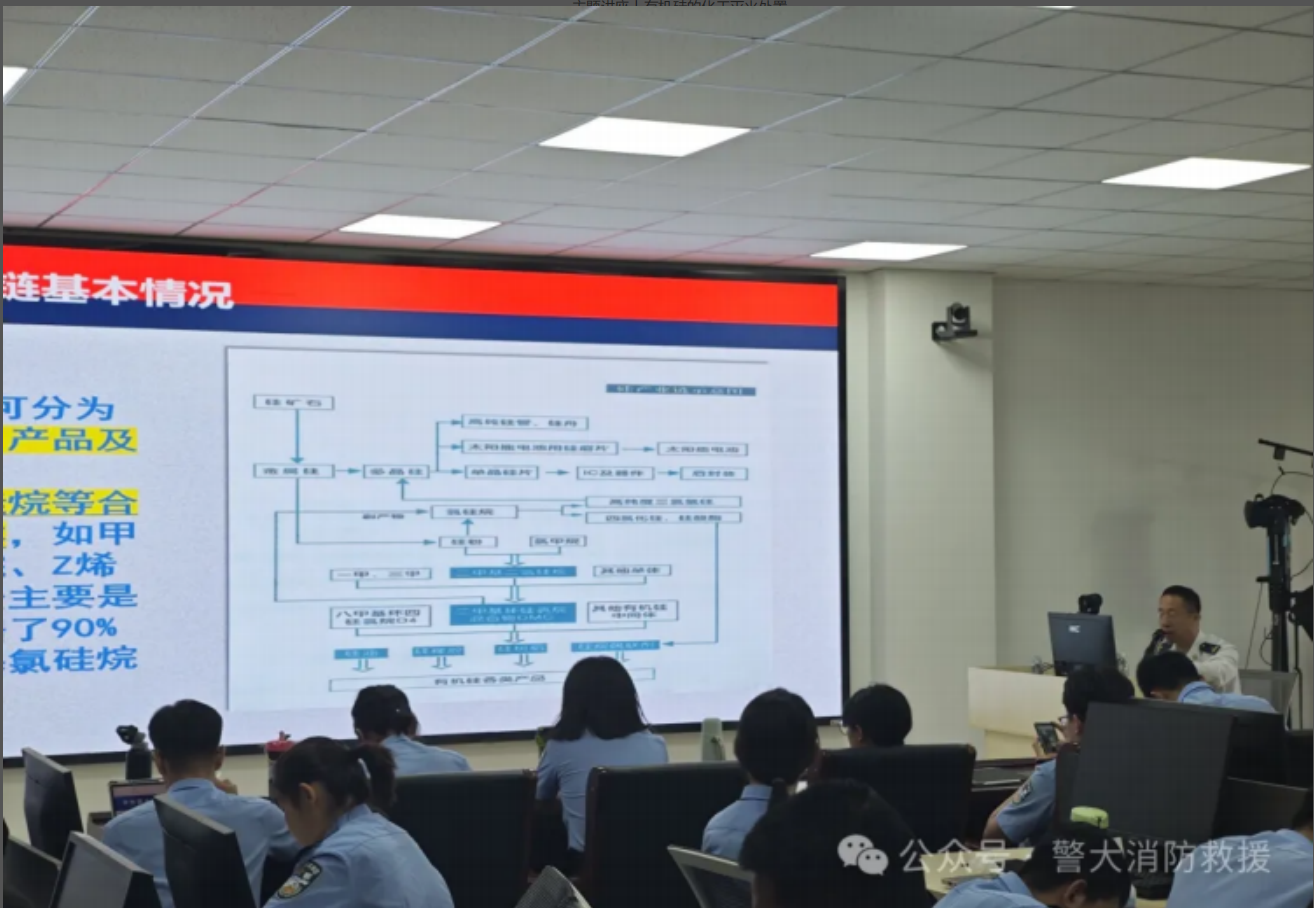 在授课中,马利平大队长从“有机硅化工硅橡胶--硅油灭火救援处置要点”“有机硅橡胶--二甲基二氯硅烷灭火救援处置要点”“有机硅化工--氯丙基三氯硅烷灭火救援处置要点”三个专题出发,介绍了氯硅烷系列产品和烷氧基系列产品的工艺流程流程,分析了有机硅火灾事故特点和难点,指出不同种类的有机硅具有的灭火救援危险性,并强调灭火救援处置要点: