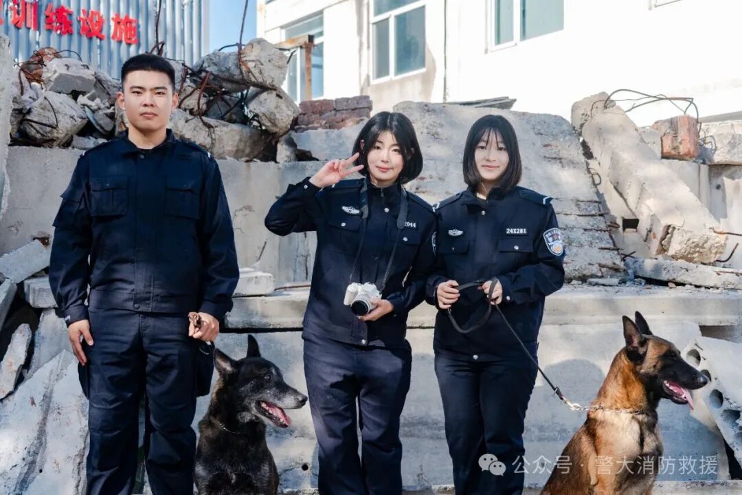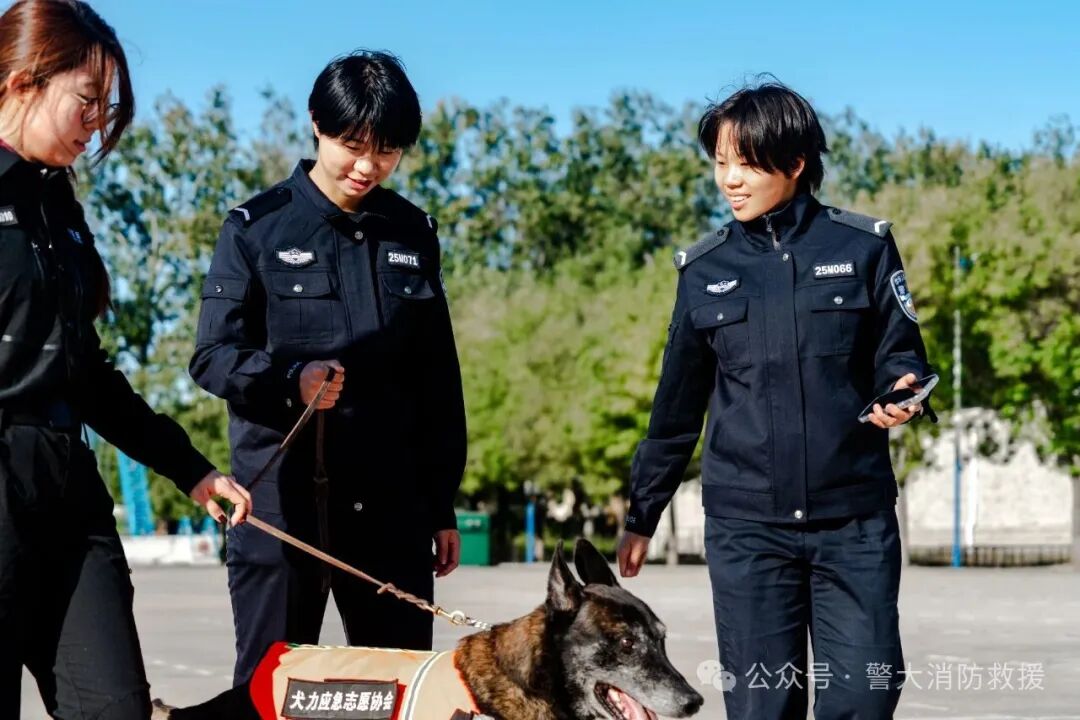 演练结束,紧张氛围被温馨与欢乐取代。卸下装备的搜救犬收起“专业模式”,化身温顺可爱的伙伴,引得同学们争相靠近。大家小心翼翼地抚摸着它们柔软的毛发,研究生二队刘岩霖兴奋地说:“刚才在演练里找目标时真的好厉害!”搜救犬也热情回应,摇着尾巴、主动蹭着同学们的手心,现场充满欢声笑语。