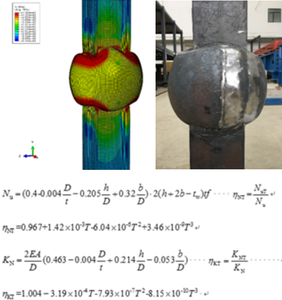 项目通过高温试验和数值分析研究了常见的圆钢管和H型钢连接的焊接球节点高温下轴压和受弯承载力以及刚度的计算方法和计算公式:首先进行了恒高温下圆钢管和H型杆件连接的焊接球节点的轴压试验,得到高温下典型节点的受力机理和破坏模式,分析温度、球径、钢材型号等参数对轴压承载力和初始刚度折减系数的影响规律;然后建立了恒高温下圆钢管和H型杆件连接的焊接球节点的力学性能有限元计算模型,研究了温度、钢材型号、是否加肋、管径与球径的比值、管径、壁厚、H型钢高度与球径的比值、H型钢宽度与球径的比值等七种参数对数值计算结果的影响作用;最后提出了高温下圆钢管和H型钢杆件连接的焊接空心球节点高温下的轴压承载力、抗弯塑性承载力、抗弯极限承载力和初始刚度计算方法和公式,计算公式与数值模拟误差在10%以内。